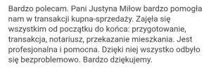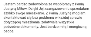 ”Jestem bardzo zadowolona ze współpracy z Panią Justyną Miłow. Dzięki Jej zaangażowaniu sprzedałam szybko swoje mieszkanie. Z Panią Justyną mogłam skontaktować się bez problemu w każdej sprawie dotyczącej mieszkania, załatwiała wszystkie potrzebne dokumenty. Jest bardzo miłą i energiczną osobą.”
