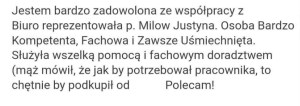 „Rewelacyjna obsługa przez Panią Justynę. Wszystko sprawnie, miło i starannie przygotowane. Wszelkie dokumenty załatwione od ręki. Pani Justyna zawsze dostępna i pomocna. Polecam.”